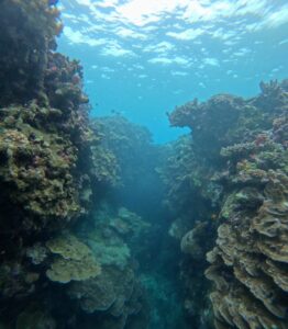 このままシュノーケルは諦めてクルージングやビーチ散策に切り替えようかと思いましたが、一か所だけきれいな水が流れこんでいる所を発見!!