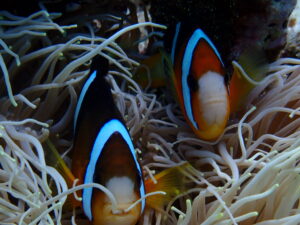 下の写真、クマノミがイソギンチャクくわえてるのかな。ヒゲ生やしてるみたいでちょっと面白い。何か出っ歯にも見えるし(笑)