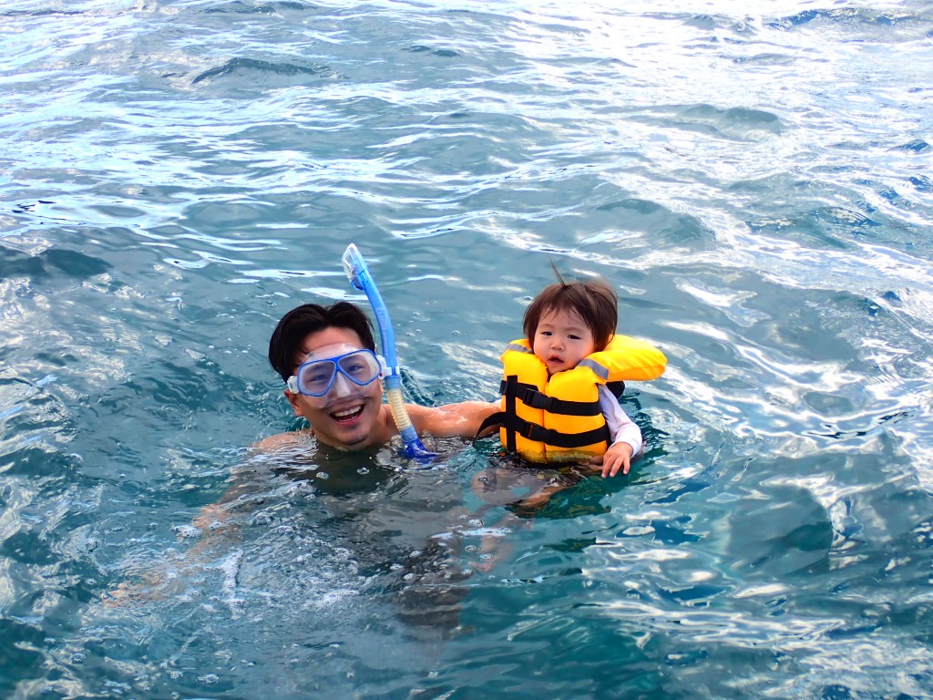 下の1歳の子は泳がないかと思いきや泳いじゃうし、お兄ちゃんはすっかり上手にシュノーケルしてるし!